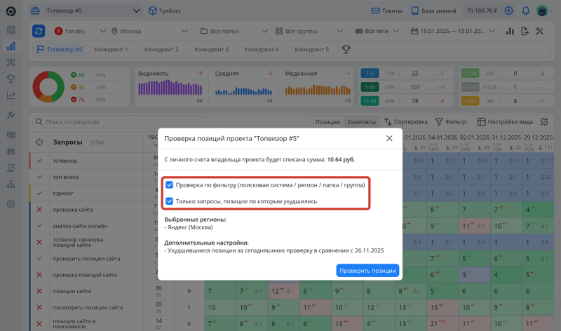 📌 Перепроверить запросы можно только в тот же день, когда была запущена проверка позиций.