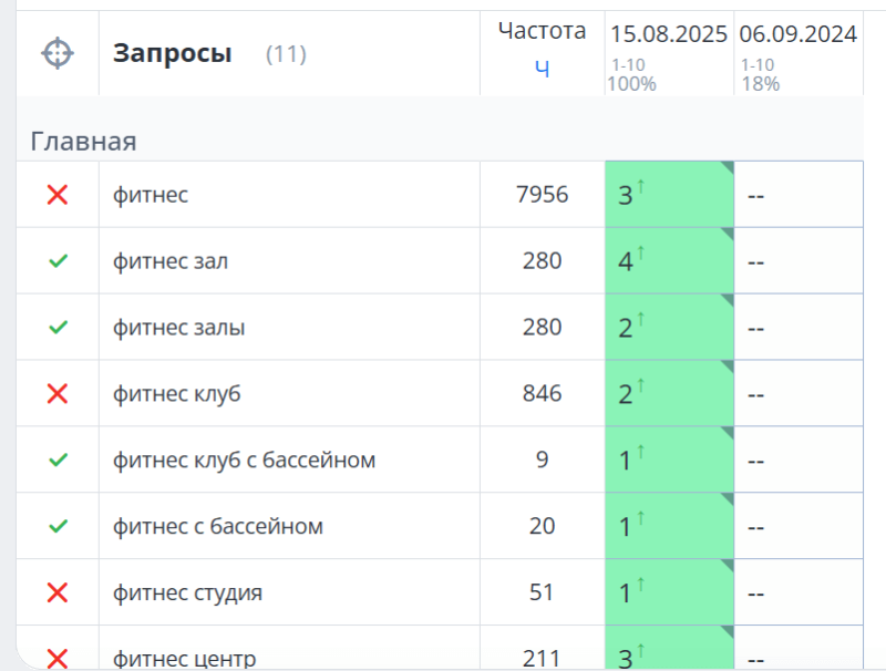 По ключевым запросам «фитнес клуб», «фитнес зал», «фитнес с бассейном» сайт закрепился в ТОП‑10.