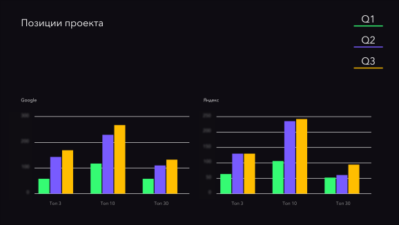 Подняли позиции в топ-3,10 и 30 поиска более чем на 100%. По итогам 3-го квартала 2024 года в топ-3 Яндекса попал 131 запрос, в топ-10 — 243, а в топ-30 — 98. Первые позиции в топ-3 Google заняли 160 запросов, в топ-10 — 259, а в топ-30 — 130
