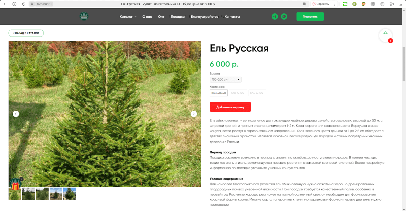 Т.е. отсутствовала шапка сайта с меню, была незаметной кнопка «Назад в каталог», различались стили кнопок. А также все URL в старом шаблоне были длинными, например: https://hvoinik.ru/listvennye-derevjya/tproduct/480148601-339131791321-klen-ostrolistnii-globozum-na-shtambe