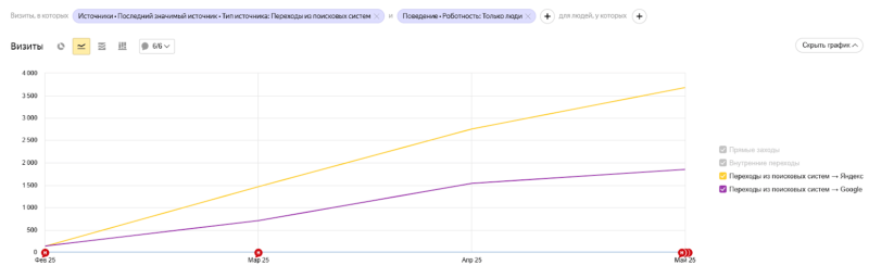 Проект продемонстрировал уверенный рост, получив значительное преимущество в органической выдаче как в Яндексе, так и в Google.