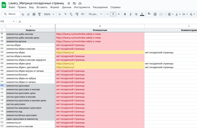 Следующим шагом выполнили сбор и согласование семантического ядра (далее — СЯ), в соответствии с полученными приоритетами (установка на отслеживание). Провели кластеризацию семантического ядра, создали матрицу распределения запросов по посадочным страницам.