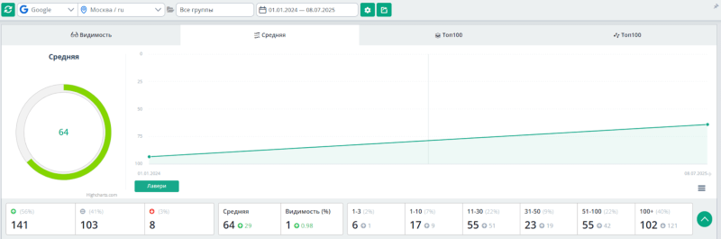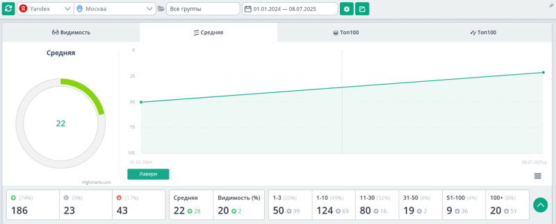 За весь период продвижения средний рост в поиске Яндекс составил 28 позиции, а в ТОП‑10 — +69 запросов.