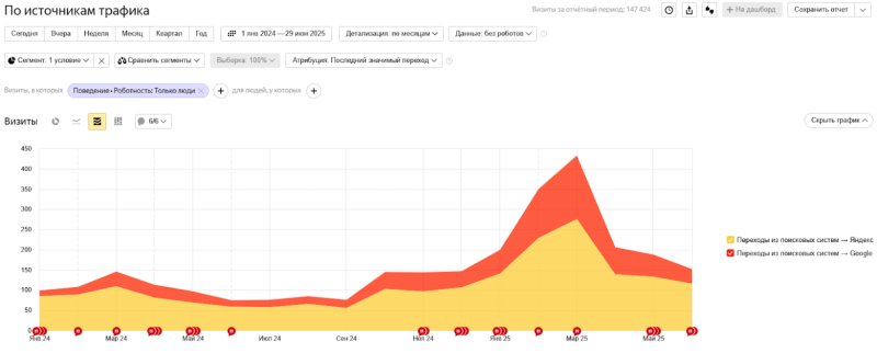 На графике показан отчет по источникам из Яндекс Метрики, где: