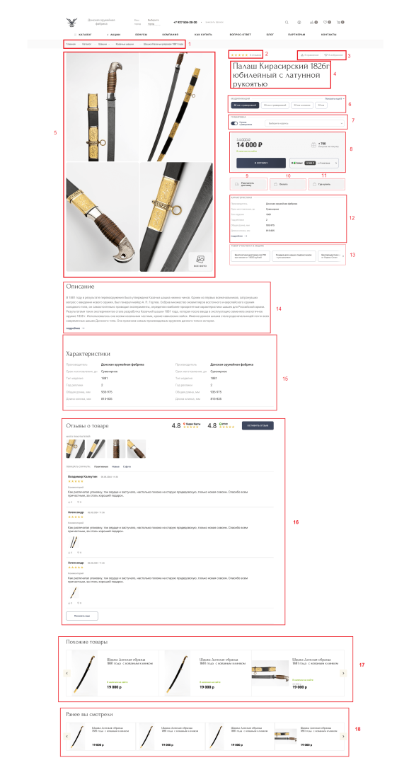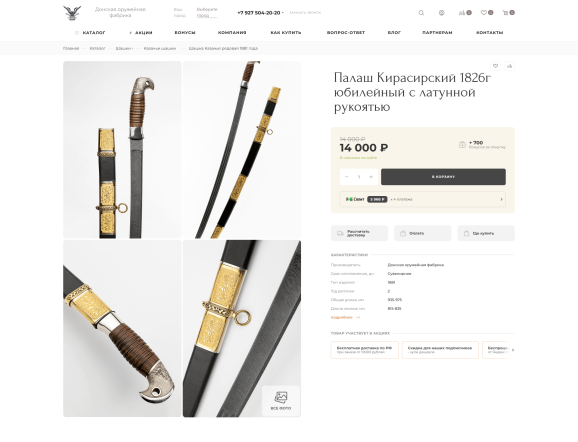• Дизайнер. Перед дизайнером стояла двойная задача. С одной стороны — передать эстетику брендовых изделий. Идею визуала заказчики описали так: «карточка товара должна быть как страница дорогой исторической книги». Мы ознакомились с некоторыми, в том числе с книгой А. Н. Кулинского «Русское холодное оружие». Из нее позаимствовали стиль — строгий, с четким фокусом на детали.