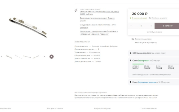 • Фотограф. Подготовили подробные инструкции: какие ракурсы нужны, на что обратить внимание. Например, сабли — длинные, блестящие, бликующие предметы, их тяжело снять без искажения: нужно много деталей, чтобы пользователь мог «увидеть» качество оружия. Заказчик нашел исполнителя и тот отфотографировал изделие как можно ближе к книге‑альбому: много вертикальных кадров высокого качества. Сделали акценты на уникальную конструкцию товаров: гарды, навершие, рукояти. Покупатель должен видеть, что он покупает.