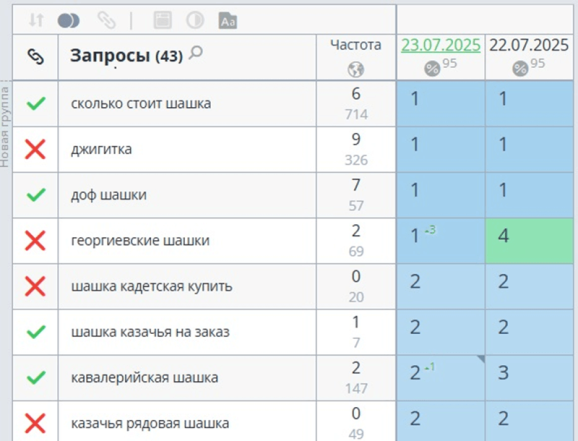 Кроме того, по данным Топвизор улучшились позиции по точечным товарным запросам — например, «шашка кадетская 1881 года» или «шашка рядовая», которые ведут не в раздел, а именно на конкретные карточки товаров. Рост позиций даже на 1 пункт в топ‑3 по таким запросам ощутимо влияет на видимость и кликабельность, а значит — и на конверсию.