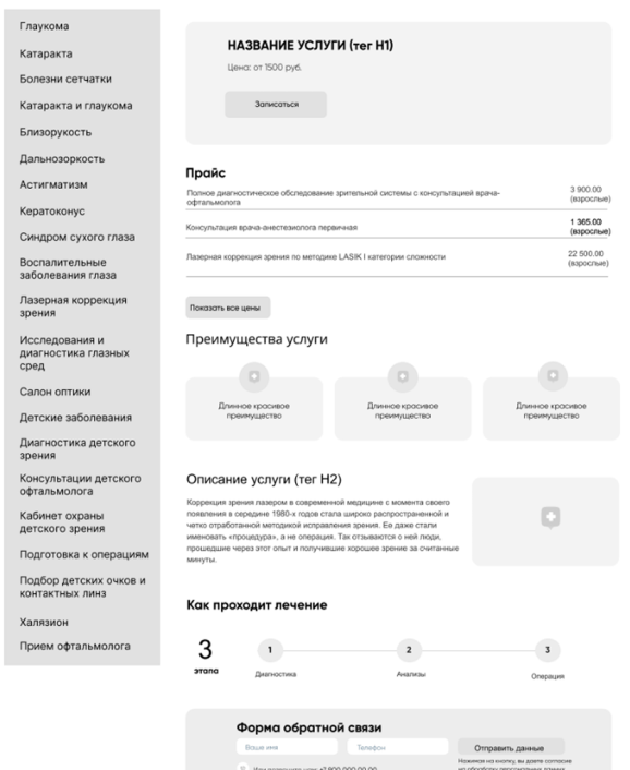 На при продвижении медицинских клиник крайне важно проработать страницы услуг. На основе анализа конкурентов Дарья подготовила прототипы, которые мы передали команде заказчика для отрисовки дизайна и внедрения на сайт.