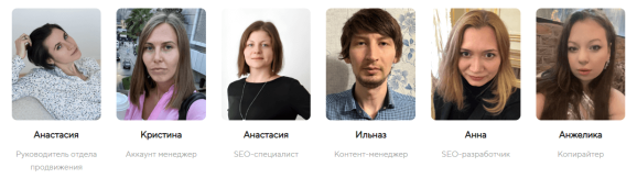 Как всегда, начинаем со сбора проектной команды. За SEO отвечает Анастасия, за проектный менеджмент — Кристина. Разработка ведется со стороны клиента, нашего специалиста мы привлекаем только в качестве консалтинга и для грамотной постановки ТЗ. Тексты тоже пишутся на стороне заказчика, а за нами остается контент‑план, постановка ТЗ, проверка и выкладка контента. Ну и все работы по SEO‑продвижению, конечно.