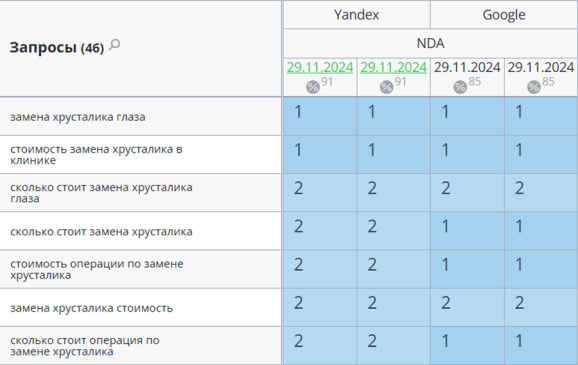 ТОП‑5 позиций по кластеру «Замена хрусталика» в Яндексе и Google