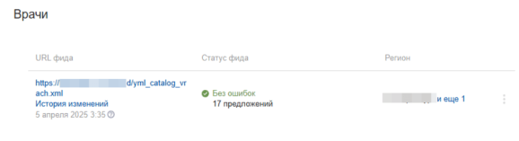 Пример загрузки XML‑фида с данными о врачах в Яндекс.Вебмастере