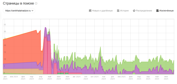 Такие нехитрые манипуляции позволили нам сократить количество исключенных страниц (красная зона) и добиться устойчивого роста количества проиндексированных страниц (зелёная зона).