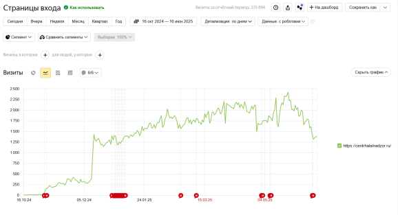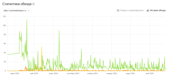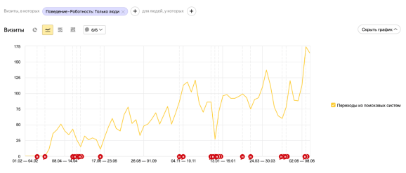 Видно, что до начала работ (до марта 2024) — поисковый бот Яндекса обходил сайт минимально, что связано с технической неготовностью и отсутствием всяких обнов на сайте. Далее обход сделался активнее и стабилизировался, вместе с индексацией и позициями.