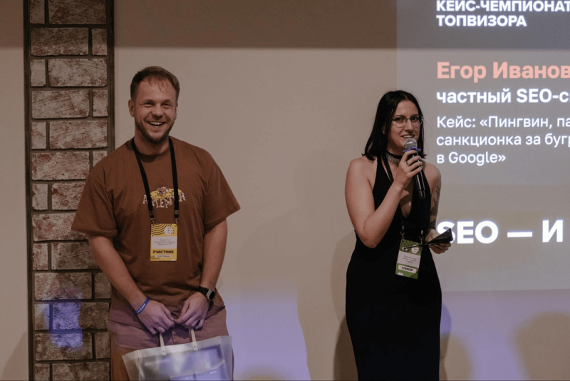 Награждали участников Кейс‑чемпионата на Optimization: в Москву приехали Юля, директор по продукту в Топвизоре, и Настя, главред Журнала. На вечеринке они подвели итоги КЧ’25 и вручили призы победителям.