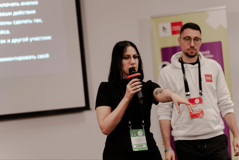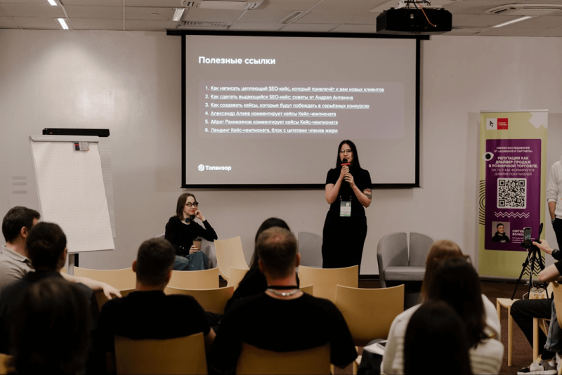 На следующий день Юля с Настей провели мастер‑класс по кейсам. Всех гостей разделили на небольшие группы, дали им вводные и результат, а участники проверяли свои SEO‑знания и пробовали отгадать, каким способом авторы кейсов добились результатов. Мастер‑класс, кстати, занял 6‑е место из 20 на конференции!