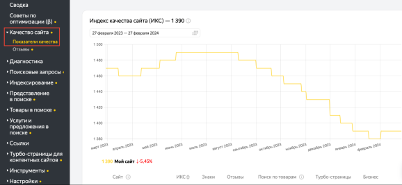 Индекс качества сайта можно проверить в панели Яндекс Вебмастера. Для этого сайт должен быть привязан к аккаунту владельца. Чтобы посмотреть ИКС, откройте вкладку «Качество сайта» и выберите раздел «Показатели качества». В нём также можно сравнить свой индекс с конкурентами.