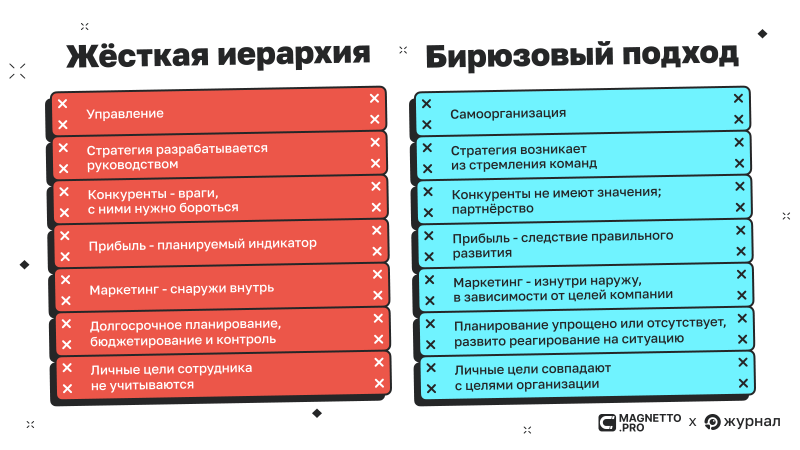 ❗Оптимальное решение — это собрать по капелькам практики обеих моделей управления. Не бывает чисто бирюзовой или чисто жёсткой структуры. Компании состоят из разных отделов, разных руководителей, разных KPI, поэтому и требования к каждому отделу могут быть разные. Расскажу про опыт Magnetto.pro.