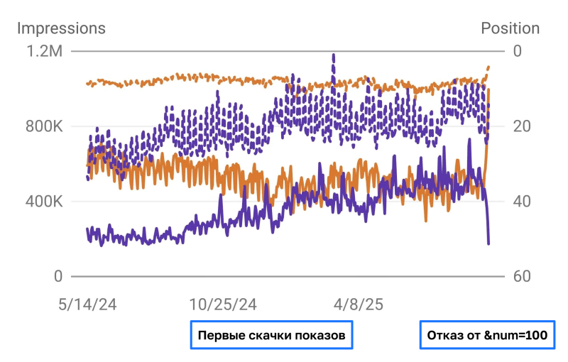По мнению Броди Кларка, при более глубоком анализе такой динамики данные не сходились: либо это ошибка, либо изменения в отчётности GSC. Ясно одно: аномалии в отчётах GSC совпали с отключением &num=100.