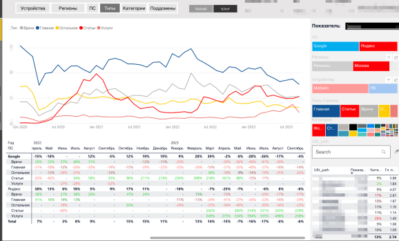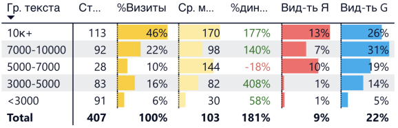 Затем мы следим: если всё работает хорошо, то есть наша стратегия срабатывает, мы видим рост трафика. Но даже когда идёт рост, есть блоки статей, которые не растут, например. Мы обращаем внимание на разные характеристики. Допустим, мы видим, что статьи, где менее 5 заголовков, не растут. Или «плохо себя чувствуют», или плохо растут в Яндексе, но хорошо — в Google. На основе этого мы делаем выводы и можем менять стратегию продвижения.