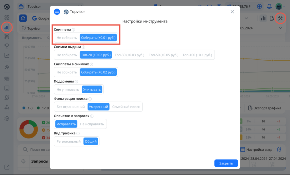 Для этого зайдите в Проверку позиций, откройте настройки инструмента и включите сбор сниппетов. Сервис соберёт их во время проверки: